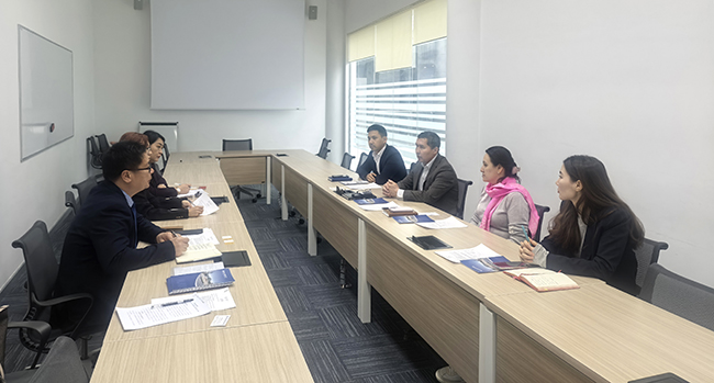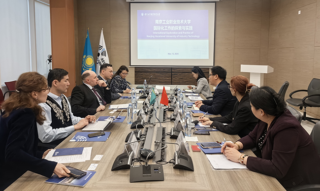 在纳扎尔巴耶夫大学,研究生院首席行政官叶尔肯·图尔甘巴耶夫(Yerken Turganbayev)、国际化处处长阿丽娅·凯莫尔迪诺娃(Aliya Kaimoldinova)、国际化处总经理阿伦·库斯潘诺夫(Alen Kuspanov)、国际化处经理艾格丽姆·扎齐特(Aigerim Zhazit)出席了会议。会上,叶尔肯·图尔甘巴耶夫希望双方围绕科研合作、教师与学生互访项目以及各类培训项目,展开深度探讨,共同探索中哈教育合作新路径,推动两国教育交流与合作迈向新高度,为“丝绸之路经济带”建设注入强劲教育动力。pg官网代表团介绍了江苏经济的整体情况、pg官网基本情况、国际化工作现状以及“中文+职业技能”教育合作方案。