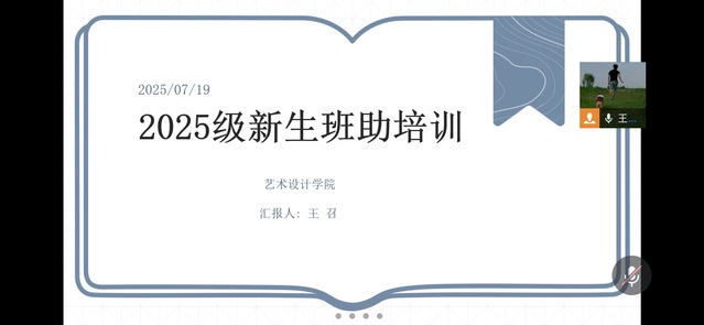 为提升新生班助的综合素养与履职能力,充分发挥其在新生适应性教育、班级管理和朋辈引领中的重要作用,确保2025级新生入学工作平稳有序开展,7月19日,艺术设计学院在腾讯会议线上召开2025级新生班助培训活动,学院党委副书记高原、学工办副主任王召、新生辅导员、全体新生班助参加了本次会议。会议由王召主持。