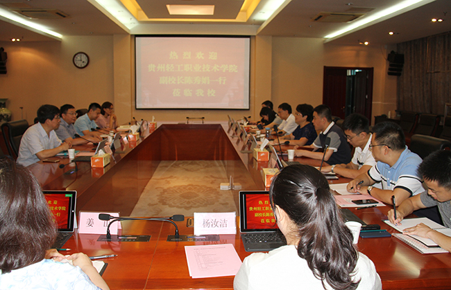 6月18日,贵州轻工职业技术学院陈秀娟副校长率领相关部门负责同志来pg官网进行工作交流。pg官网朱建国副校长,以及人事处、质控处、教务处等部门负责同志接待了来宾。