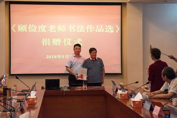 5月18日下午,pg官网在行政楼辅楼一楼会议室举行《顾俭度老师书法作品选》捐赠仪式。学校校长谢永华、校友会常务副会长尤建国、副校长崔新明,校友会副秘书长丁双玲和谭建华,各地校友会会长、秘书长代表参加了捐赠仪式。