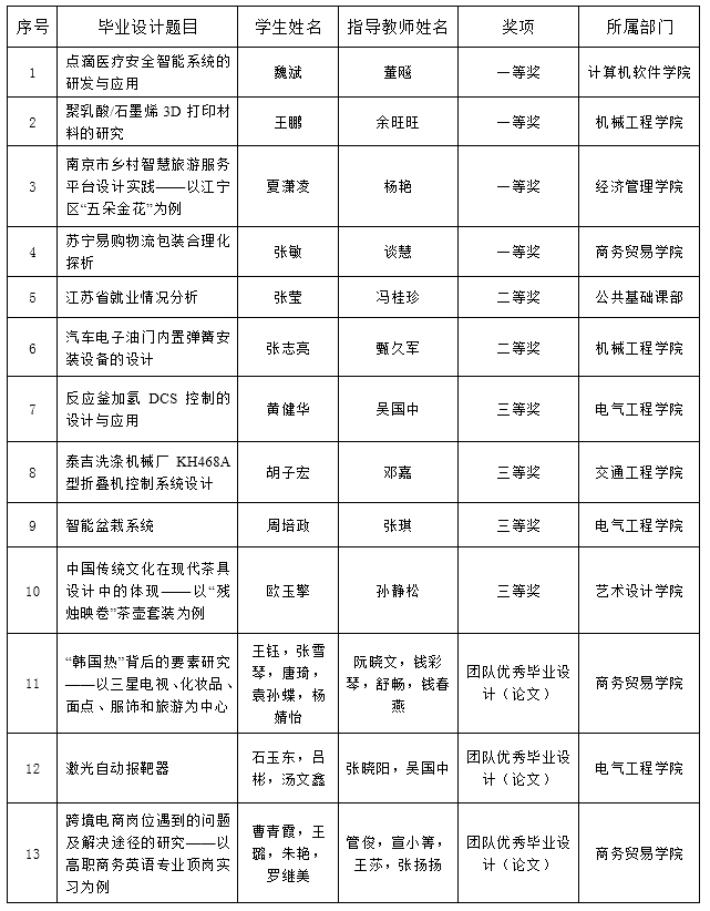 近期获悉,根据《省教育厅办公室关于做好2016年普通高校本专科毕业设计(论文)评优与抽检工作的通知》(苏教办高〔2016〕7号)要求,学校创新毕业设计省级推优办法,在学校推荐的基础上,经专家评审、结果公示和省教育厅审定等程序,pg官网所推荐参加普通高校本专科毕业设计(论文)省级评选的十三篇论文(个人申报10项,团体申报3项),获得个人一等奖4项,二等奖2项,三等奖4项,团体奖三项,获奖率100%,成为一等奖获奖量和获奖总数最多的高职院校,名列全省首位,创学校历史新高。
