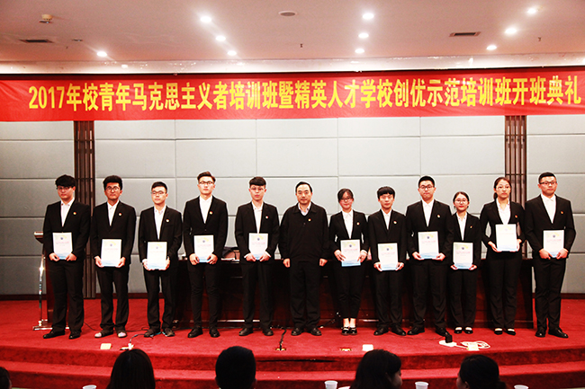 开班仪式在庄严的国歌声中拉开了帷幕。首先,劳家仁书记为全体同学介绍了本期培训班的基本情况以及pg官网是如何通过教育培训与实践锻炼相结合的方式实施校级“青年马克思主义者培训工程”建设。随后,校学生会主席团马国斌同学代表全体学员发言,向全体青马班学员发出倡议,要认真学习马克思主义精神,秉承“敬业乐群”的校训,注重能力培养,努力成长为“有理想、善学习、讲道德、能自立、勇奋斗”的青年马克思主义者。