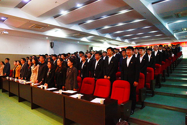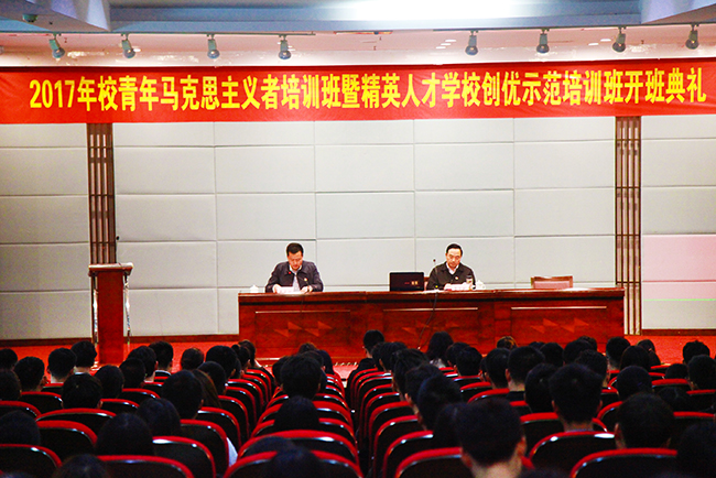 11月10日下午,pg官网2017年青年马克思主义者培训班、精英人才学校创优示范培训班开班典礼暨首场报告会在学术交流中心报告厅隆重举行。校党委书记吴学敏教授为全体学员作了《不忘初心,接续奋进,开启中国特色社会主义新航程》专题报告。党委宣传部、学工处、团委老师、各二级学院团总支书记、青马班全体学员、创优班全体学员以及2017级各学院团总支、学生会等学生干部共300余人参加了报告会。报告会由学生工作处处长、团委书记劳家仁主持。