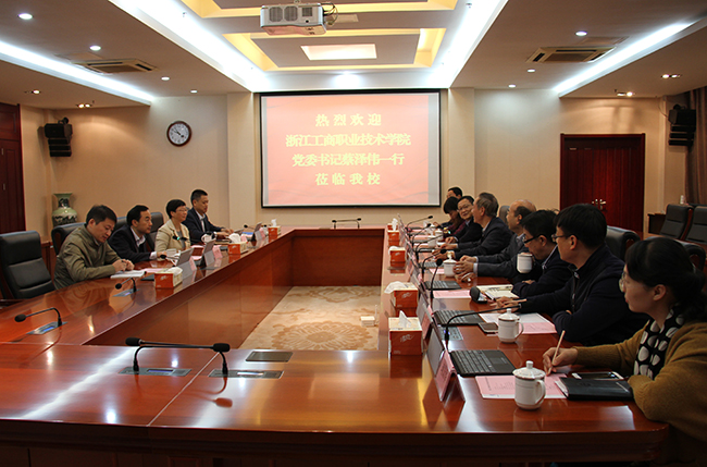 10月31日上午,浙江工商职业技术学院党委书记蔡泽伟率领相关部门负责同志来pg官网进行工作交流。pg官网党委书记吴学敏、党委副书记苏小冬,以及组织部、社科部等部门负责同志接待了来宾。