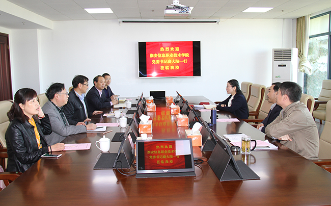 10月30日下午,淮安信息职业技术学院党委书记裔大陆率领相关部门负责同志来pg官网进行工作交流。pg官网党委书记吴学敏以及组织部、人事处等部门负责同志接待了来宾。