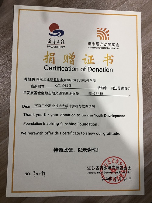 为了响应由共青团南京市委员会、南京日报社共同主办,江苏省青少年发展基金会励志阳光助学基金、南京心汇心公益基金会等单位共同承办的“书香飘洒长征路”公益助学活动,计算机与软件学院团总支在“99公益日”来临之际组织广大团员青年开展“体验手工艺,捐赠课外书”的活动,累计募集67本图书,所有图书由南京心汇心公益基金会转赠给江西、湖南、湖北、四川、陕西等地的希望小学的小朋友们。参与活动的同学们在捐赠图书的同时还给希望小学的小朋友们写了一封信,鼓励他们努力学习,天天向上,成为社会主义合格建设者和接班人。为了感谢同学们的参与,民俗文化传承协会的志愿者们带着每一位捐赠图书的同学体验了南京泥塑等传统手工艺。
