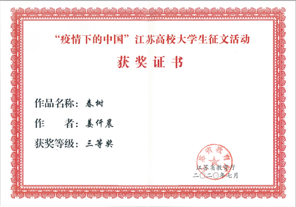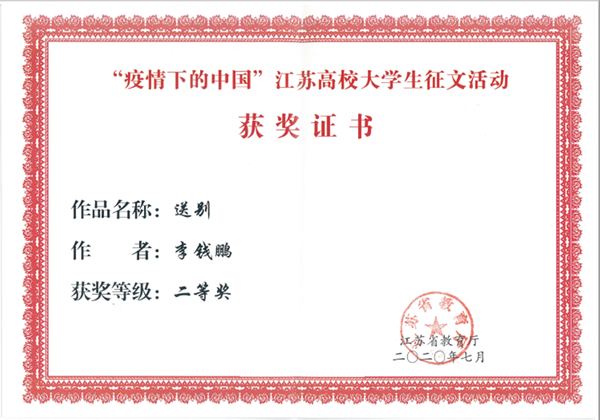 自活动开展以来,全校学生积极参与,经各学院初审,学校评选,共推选参评3篇征文作品,作品记录了同学们在疫情防控期间的难忘时刻和心路历程,讲述了抗疫期间人与人之间的温暖善意和真挚情感,书写了身边的抗疫感人事迹,强化责任与担当,树立爱国主义情怀,坚定决胜信心,传递出众志成城、共克时艰的强大正能量。最终pg官网电气工程学院电气1814班李钱鹏同学的文章《送别》获得了省赛二等奖,建智1911班姜仟晨同学的文章《春树》获得省赛三等奖。