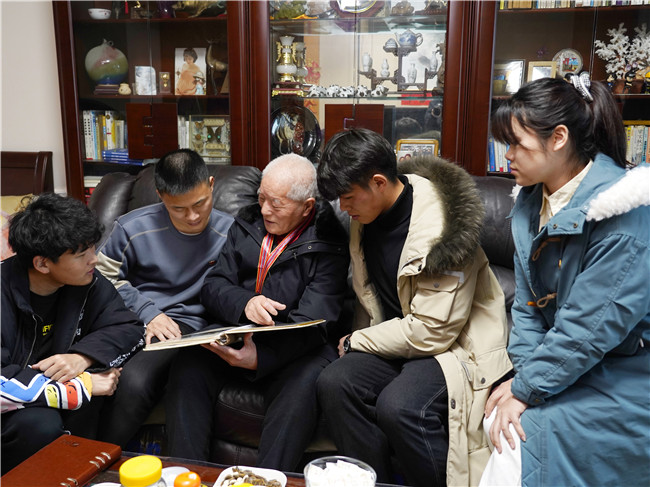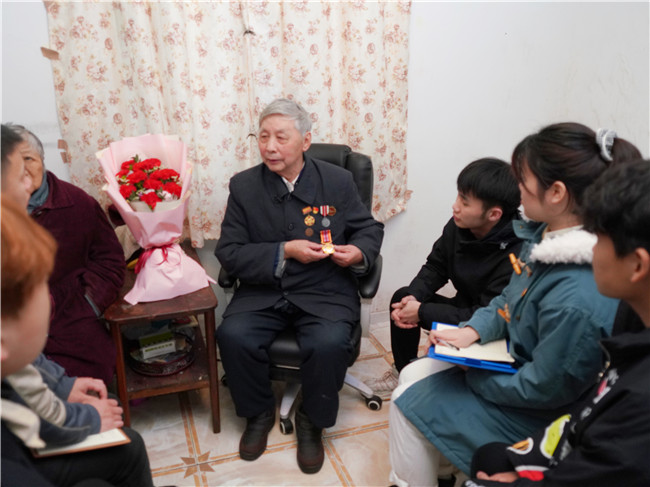 在南京,实践团调研组的成员们看望了“中国人民志愿军抗美援朝出国作战70周年”纪念章的获得者蔡瑞华、王荣满和成诗开三位老人。三位英雄带领大家走进了那段血与火的历史,为大家上了一堂生动的爱国主义课程。