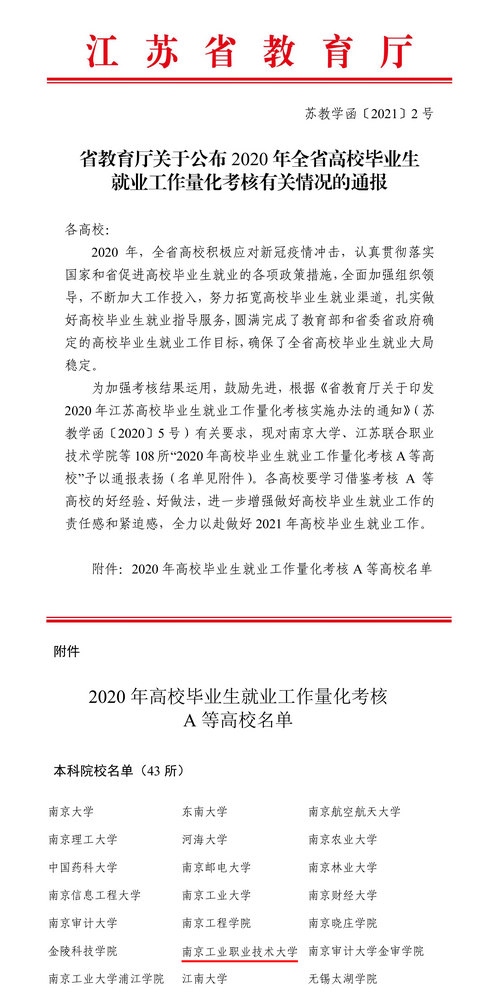 江苏省教育厅近日下发了《关于公布2020年全省高校毕业生就业工作量化考核有关情况的通报》(苏教学函[2021]2号),对认真贯彻落实国家和省促进高校毕业生就业的各项政策措施,加强组织领导,加大工作投入,努力拓宽高校毕业生就业渠道,扎实做好毕业生就业指导服务,圆满完成既定就业工作目标的高校予以通报表扬。pg官网荣获2020年毕业生就业工作量化考核“A”等次。