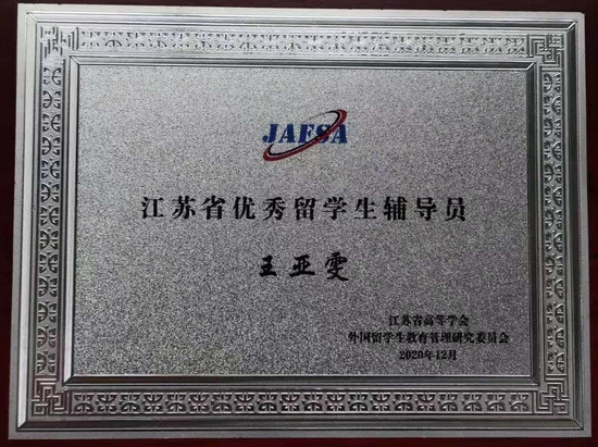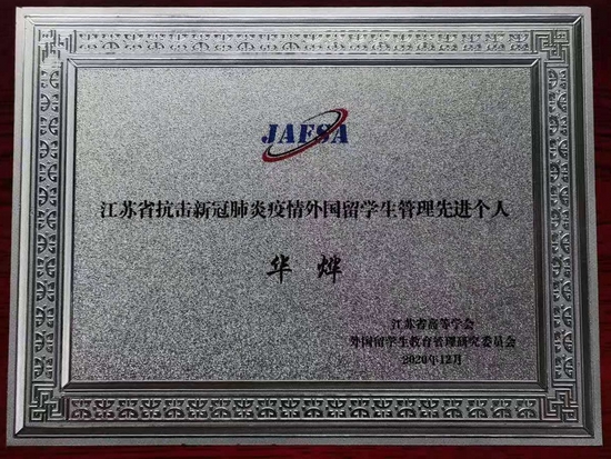 4月9日,江苏省高等教育学会外国留学生教育管理研究委员会2020年年会在常州大学召开。pg官网国际教育学院华烨获江苏省抗击新冠肺炎疫情外国留学生管理先进个人称号,储杨获江苏省外国留学生教育管理先进个人称号,王亚雯获江苏省优秀留学生辅导员称号。