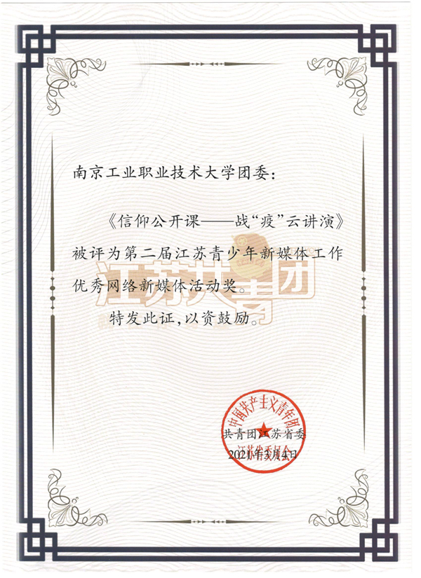 近日,由中共江苏省委网信办指导,共青团江苏省委、江苏青少年新媒体联盟主办的第二届江苏青少年新媒体工作优秀项目奖评选结果正式揭晓。经过专家组评审、现场答辩和网络公示等环节,pg官网团委荣获“新媒体建设先进单位”;“信仰公开课——战‘疫’云讲演”项目荣获“优秀网络新媒体活动奖”。