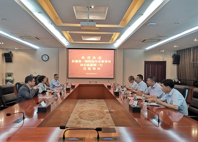 5月21日上午,新疆第一师阿拉尔市教育局局长杨建刚一行来pg官网考察调研。党委常委、副校长苏小冬,以及校长办公室、教务处、科技处、发展合作处等部门负责同志在行政楼辅楼一楼会议室接待了来宾。