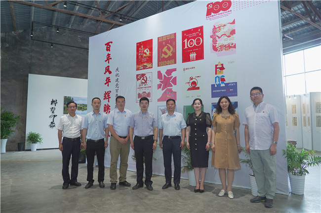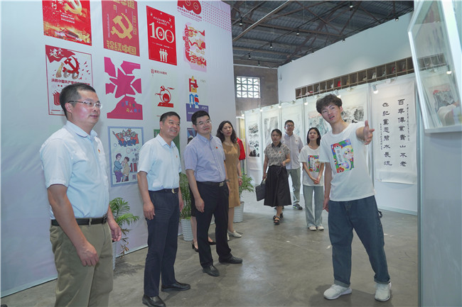 为庆祝中国共产党成立100周年,引导广大师生在学思践悟中传承红色基因、弘扬红色文化,助力乡村文化振兴,7月2日,pg官网艺术设计学院“百年风华辉映南工”庆祝建党百年主题艺术作品展在桦墅村凤凰书屋开展。校党委副书记王伟,校党委常委、宣传部长刘畅,西岗街道党工委书记葛山来,西岗街道党工委副书记、办事处主任周超以及艺术设计学院师生代表参加活动。