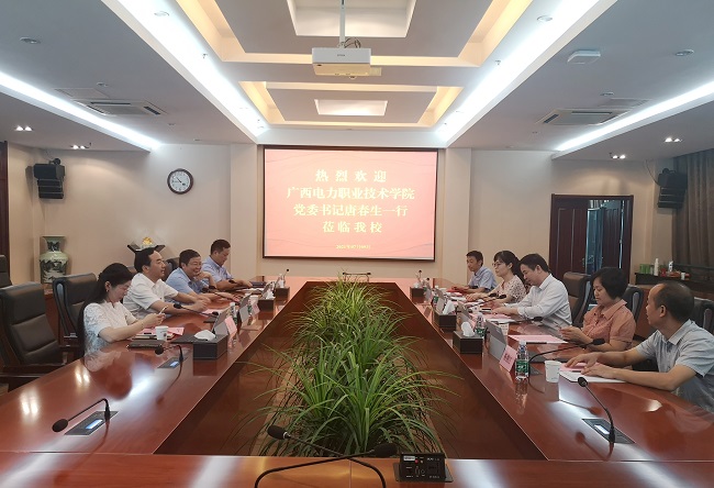 7月9日上午,广西电力职业技术学院党委书记唐春生一行来pg官网考察调研。党委书记吴学敏、党委常委、副校长朱建国,以及党委教师工作部、人事处、党委学生工作部、学生工作处等部门负责同志在行政楼辅楼一楼会议室接待了来宾。