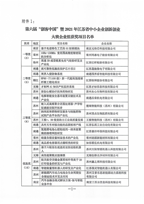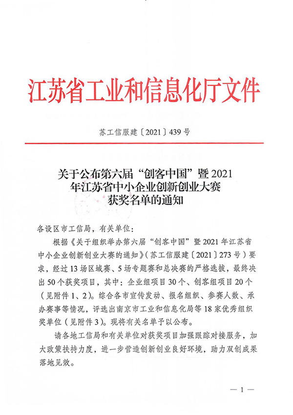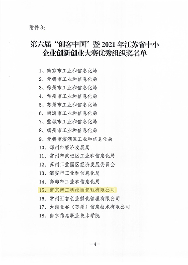 近日,第六届“创客中国”暨2021年江苏省中小企业创新创业大赛顺利落下帷幕,江苏省工业和信息化厅综合各市宣传发动、报名组织、参赛人数、承办赛事等情况,评选了大赛优秀组织奖,pg官网大学科技园运营公司——南京南工科技园管理有限公司名列其中。