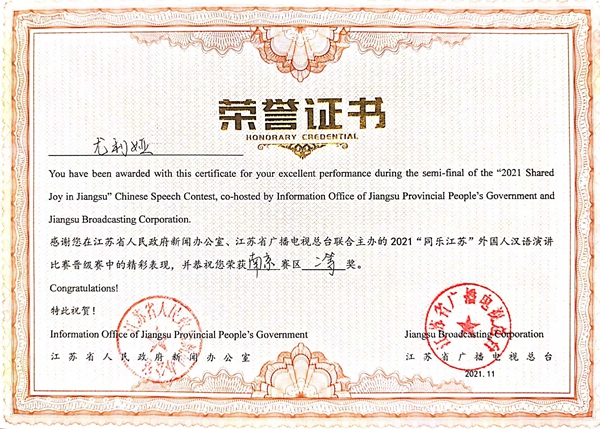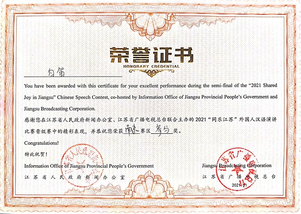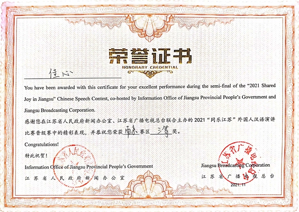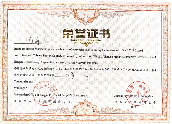 由江苏省人民政府新闻办公室、江苏省人民政府外事办公室、江苏省教育厅等单位共同主办、江苏省广播电视总台承办的2021“同乐江苏”外国人汉语演讲决赛通过云录制的方式举行。来自五大洲20多个国家的100多名留学生汉语达人参与比赛,经过激烈地角逐,pg官网留学生安莉同学获得总决赛三等奖;常国进、尤利娅两位同学获得南京赛区二等奖;阿瑞、佳心同学获得南京赛区三等奖,白迪同学获得参与奖,取得了“同乐江苏”比赛有史以来最好成绩。