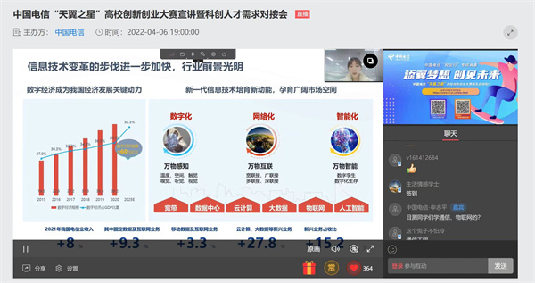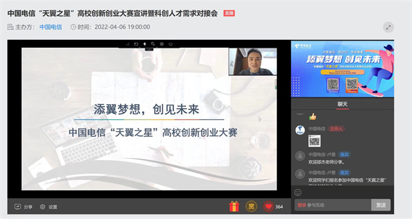 为了贯彻落实国家发展和改革委员会、教育部、人力资源和社会保障部等部门联合印发的《关于深入实施创业带动就业示范行动力促高校毕业生创业就业的通知》(发改办高技〔2022〕187号)文件精神,做实双创示范基地结对共建,4月6日,pg电子中国官方网站与中国电信集团有限公司联合举办“天翼之星”高校创新创业大赛线上宣讲暨科创人才需求对接会。学校创新创业学院相关负责人以及近300名师生代表参加了线上会议。