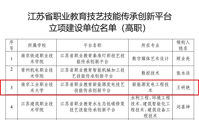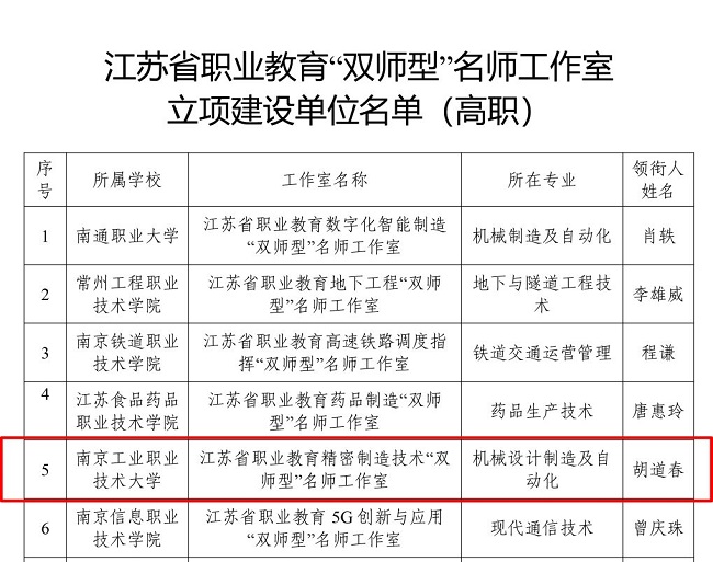 日前,省教育厅正式公布首批江苏省职业教育“双师型”名师工作室和技艺技能传承创新平台建设单位名单,pg官网由机械工程学院胡道春老师领衔的“江苏省职业教育精密制造技术‘双师型’名师工作室”和电气工程学院王研艳老师领衔的“江苏省职业教育新能源发电技艺技能传承创新平台”获批立项。