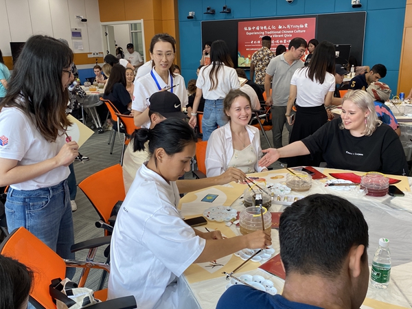 中外师生以“花好月圆、温情思念、千里婵娟”等为主题,在扇面上作图
