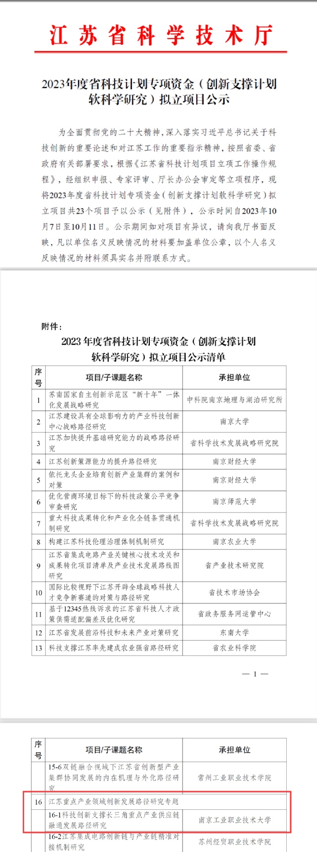 2023 年度省科技计划专项资金(创新支撑计划软科学研究)拟立项目公示清单