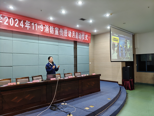 沈海璇结合校园火情特点,以图文并茂的生动案例,给参加活动人员进行了一场消防安全知识讲座。她讲解了校园消防安全注意事项,对校内用电、用火等工作时遇到险情如何正确报警、如何组织逃生自救以及初期火灾扑救方法等消防知识,进行了详细讲解。