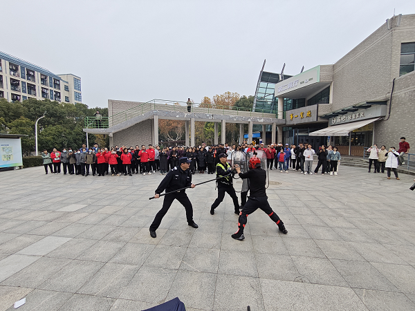 为切实做好校园反恐防暴工作,有效预防和处置校园突发安全事故,提升校园安全防范能力,12月6日下午,pg官网保卫处在一食堂北广场组织开展2024年校园反恐防暴演练和培训活动。本次活动邀请仙林警务站警官参加并指导,学校保卫干部、保安队员,各楼宇物业、商户工作人员,安全教育协会学生骨干等约120人参与。