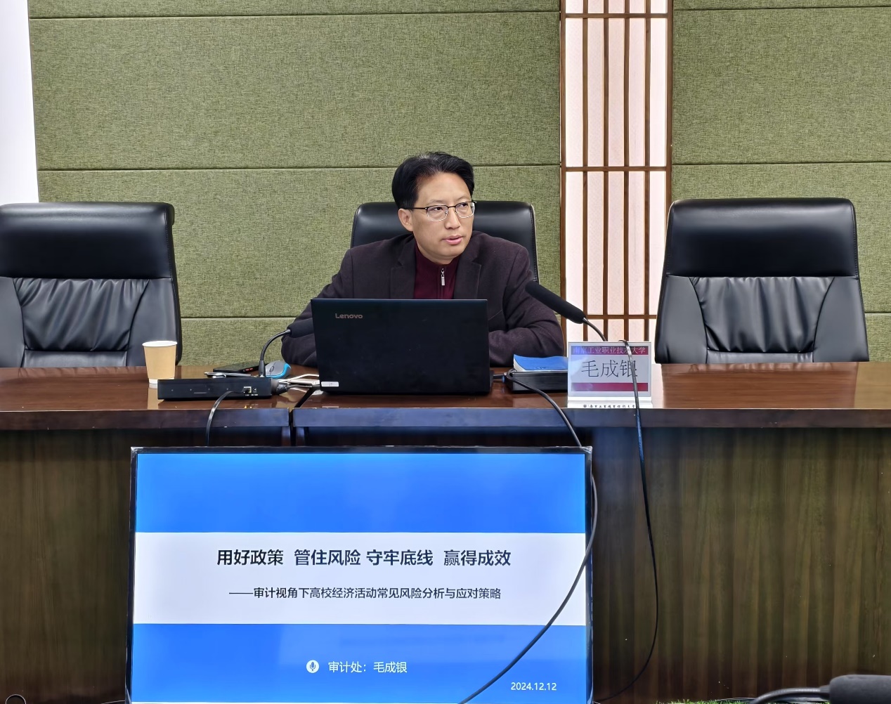 毛成银从高校经济活动常见的风险、如何管住风险以及如何看待高校内部审计三个方面,向辅导员介绍了审计工作的重要性和必要性,帮助辅导员树立规矩意识、制度意识、责任意识,自觉接受监督,习惯在监督下用权,并对辅导员如何管理经济活动、促进校园活动规范化、帮助家庭经济困难学生等方面提出宝贵建议。